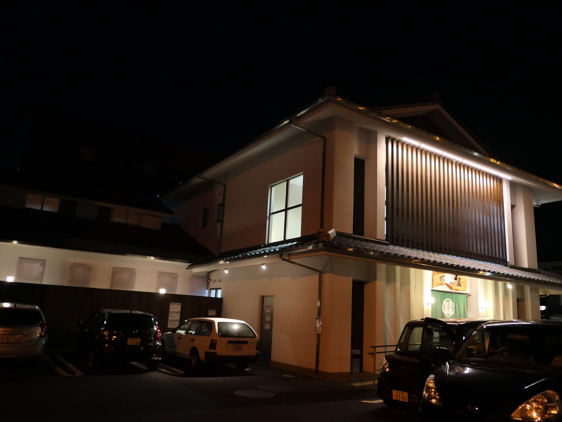 밤에 조명을 받은 하얀 외벽과 정갈한 나무 창살 무늬가 어우러져 묘하게 세련된 느낌을 준다.