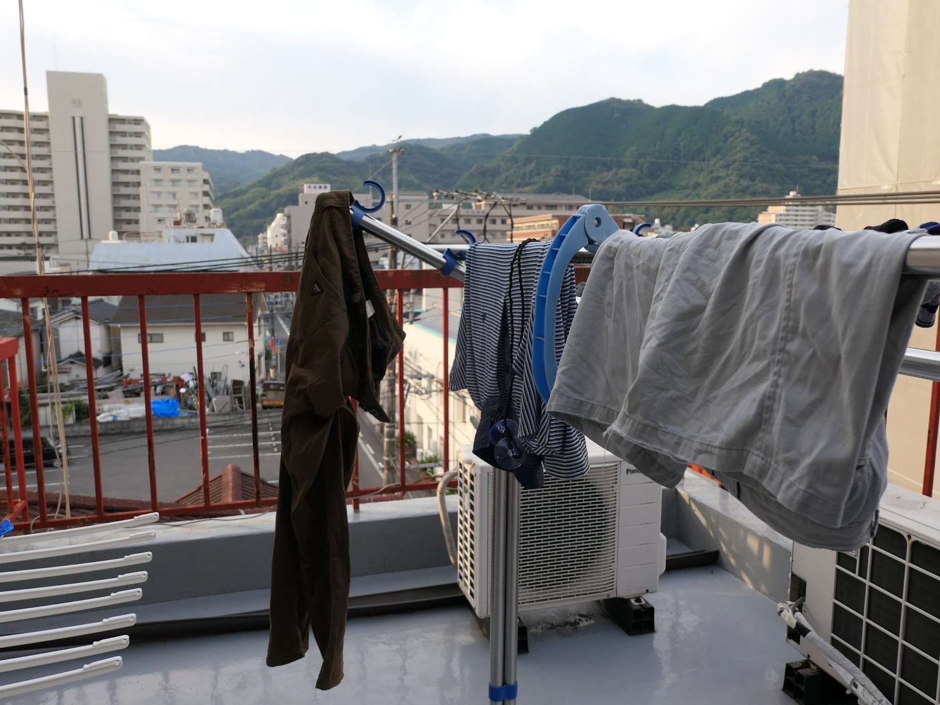 밤에 게스트하우스 옥상 세탁실에서 빨래를 하고 널었다.